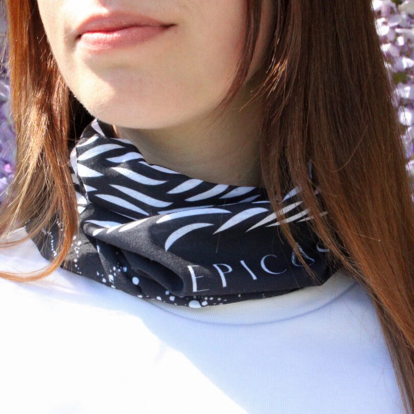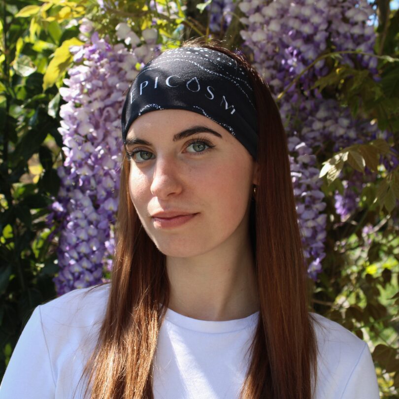 Bandeau Skincare EPICOSM en polyester recyclé noir avec motif blanc.